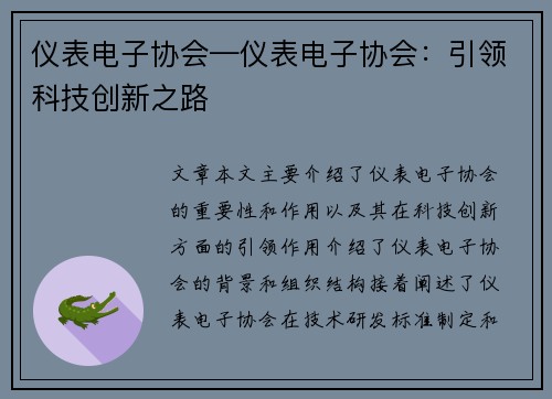 文章本文主要介绍了仪表电子协会的重要性和作用,以及其在科技创新方面的引领作用。介绍了仪表电子协会的背景和组织结构。接着,阐述了仪表电子协会在技术研发、标准制定和人才培养方面的贡献。然后,详细介绍了仪表电子协会在推动科技创新、促进产学研合作、推广行业应用等方面的工作。总结了仪表电子协会的重要性和未来发展方向。