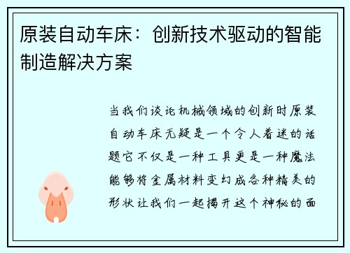 当我们谈论机械领域的创新时,原装自动车床无疑是一个令人着迷的话题。它不仅是一种工具,更是一种魔法,能够将金属材料变幻成各种精美的形状。让我们一起揭开这个神秘的面纱,探索原装自动车床的奇妙世界。