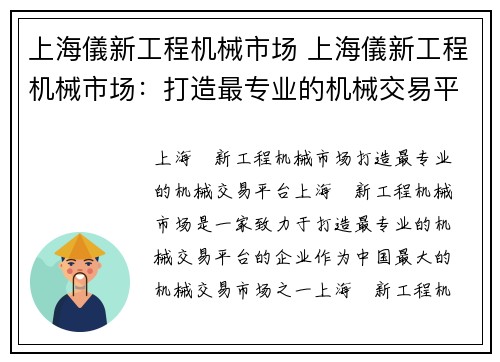 上海儀新工程机械市场是一家致力于打造最专业的机械交易平台的企业。作为中国最大的机械交易市场之一,上海儀新工程机械市场以其丰富的资源、专业的服务和创新的经营理念,吸引了众多国内外企业的关注和合作。下面将从多个方面详细阐述上海儀新工程机械市场的特点和优势。