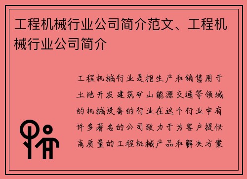工程机械行业是指生产和销售用于土地开发、建筑、矿山、能源、交通等领域的机械设备的行业。在这个行业中,有许多著名的公司致力于为客户提供高质量的工程机械产品和解决方案。本文将介绍一家工程机械行业公司的简介,以引起读者的兴趣,并提供相关的背景信息。