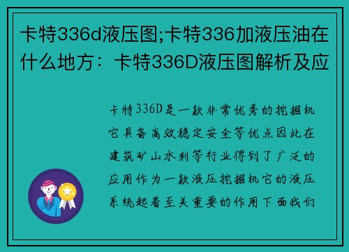我们需要知道卡特336D加液压油的地方。卡特336D的液压油加油口位于机器右侧的液压油箱上。在加液压油之前,需要先检查液压油的质量和油位,确保液压系统正常运行。